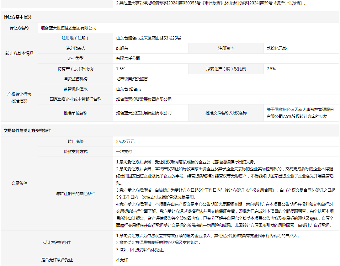 - 轉(zhuǎn)讓方:煙臺(tái)藍(lán)天投資控股集團(tuán)有限公司
