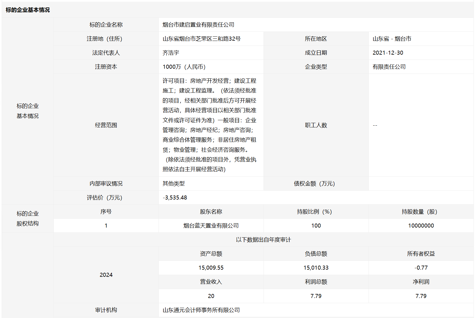 煙臺市建啟置業(yè)有限責任公司100%國有股權