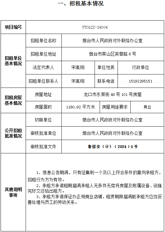 煙臺(tái)市南大街267號(hào)一樓東側(cè)門頭房招租公告
