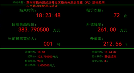 近日,萊州市稅務局經(jīng)濟開發(fā)區(qū)稅務分局所屬房屋建筑物及所占土地20年使用權(quán)轉(zhuǎn)讓項目在煙臺產(chǎn)權(quán)掛牌并有多個意向受讓方報名,最終,經(jīng)過72輪激烈報價,項目較掛牌底價122萬元,增值261萬元,增值率高達212.56%,不但保證了疫情期間國有產(chǎn)權(quán)業(yè)務的正常開展,而且?guī)椭a(chǎn)權(quán)持有人實現(xiàn)了價值最大化。